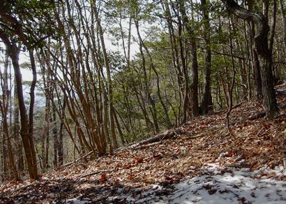 高さしか空間が無い。道脇は落ち葉の雑木林である。ただ低木多し。天気のいい尾根道を辿ると