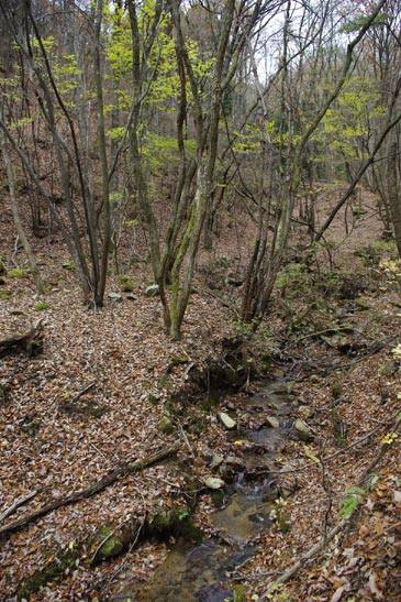 雑木に囲まれた広い谷の源頭について一息。鳴き声は遠ざかった様子なので、この谷から大谷へ下りていこう。