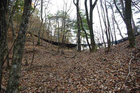 尾根の手前は急斜面。手をつきながらよじ登る。尾根に出ると荒れ果てた黒いネットが残っている。