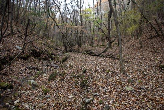 落ち葉の中を沢がチロチロと流れる静かな世界。落ち葉を踏みながら少しずつ谷をつめていく。