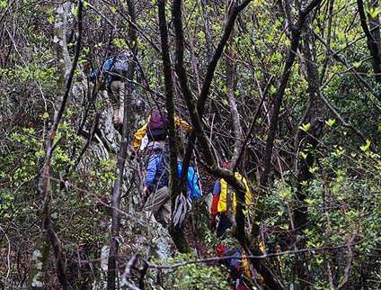 再び新緑の尾根。急斜面を幹に捉まりながら下りていきます。