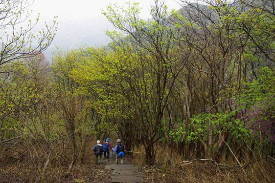 薄いレモン色のヒカゲツツジも現れてきた。赤い若葉の木も有って華やかな彩りに包まれてくる。