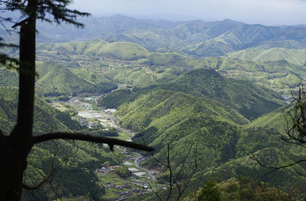 ガスの三岳と新緑の谷