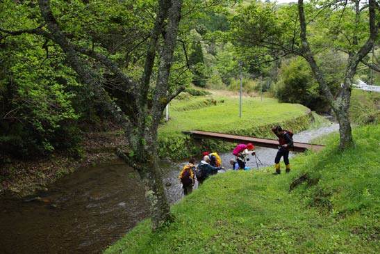 清流を渡り、振り返った山は新緑が押し寄せ来るように明るい。その幸運の色をそのまま実現したように