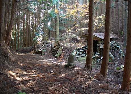 時々倒木があります。植林に入り、少し広がったところに石で囲った枠取りが残っています。たぷんここが鳴の堂跡