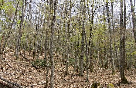 時間も遅いし、今までの新芽の林を歩いただけでも満足とし山頂は断念。食後に西の鞍部で
