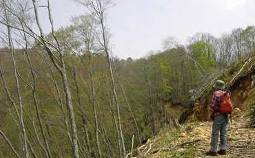 どこに採ったらよいか判りにくい。対岸の斜面も滑りそうだし沢に沿えば切れ落ちている。