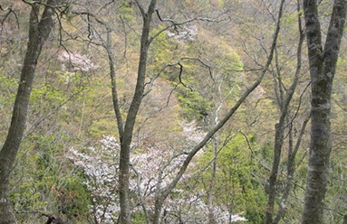 日差しが足下の落ち葉をカラカラに乾かしている。明るい新芽の斜面を登っていく。いいねぇ。
