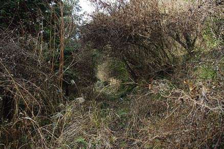 雑木疎林の谷から植林に変わる。仕事道を探しだししばらく下りるとササヤブの間の荒れた山道に変わった。