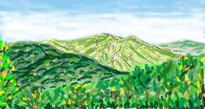 ■目的地:歌垣山(554m)<山域:北摂・大阪府能勢町> ■日にち:1997年6月13日(金) ■天気:曇り時々晴れ ■同行者:単独 ■コースタイム: 堀越峠 [約390m](12:00)〜山頂(12:35)〜北のピーク(12:45-13:25)〜 栗畑の林道〜ゲート(14:00)〜杉原の府道(14:20)〜堀越峠(14:30) 【歌垣山】 妙見山の北にある里山。上代の頃は、若い男女が頂上で歌を唄いながら 踊る「うたかい」が行われていたと伝えられている。 西麓の倉垣天満宮には樹齢400年といわれる銀杏の木と、能勢の地酒「秋鹿」 (あきしか:辛口)の酒蔵がある。地味だが私のお気に入りの山の一つである。 あきゆきさんの生駒やPLUTOさんの比良の話に出てきはじめたササユリ。 北摂にもササユリが咲くという話は聞いていたので、見たいなと思っていた。 ただ、この季節に低山の北摂に入るのは、私としては一大決心なのです。(^^; 去年の12月に変わり果てた歌垣山に登った時、「歌垣山ササユリの小径」という 小さな札が気になっていたので、お手軽ササユリ散歩と決め込みました。 ちなみに、ササユリは能勢町の町花です。大切にして下さいね。盗掘厳禁!! 【堀越峠】 府道を車で上がると堀越峠。妙見奥の院への道が右に伸びる。 そこをおばさん3人組が歩いていた。奥の院で昼御飯かな。 私はその反対側へ府道脇の松の林を登る。丁度良い棒きれが落ちていたので、 これはと思い、「へびさん、あっちに行ってね棒」として今日の散歩に同行してもら うことに。(^^; シジュウカラが鳴く。整備された道を5分も登れば、後ろに奥の院の森が見えて くる。日当たりのいい道をキョロキョロしながら登る。赤い小さなザクロような花を つけたカンサイスノキを見つけた。お目当てのササユリはない。とうに盛りの過ぎた ピンクのツツジがポツリ。草の緑が勢いづいている。 【つぼみ】 半ばあきらめムードで夏草だけの北摂に不満を覚えながら登っていく。 おぉっ、つぼみから少し開き加減のササユリ発見。うーーん、もう少し開いてくれ たら絵になるんだがなぁ。残念。でも、ササユリがあると確認できて元気が出てきた。 その周りを見ると、薄い緑色のつぼみがぽつりぽつりとあるではないか。「やっぱり ササユリの小径は本当なんだ。」と納得する。ちょっと時期が早かったかなぁ。 【開発】 平坦道になって、前方にスカスカになった松林が現れる。下草が払われて いるようだ。見晴らしは多少良くなっている。さらに行くと山頂だが、前回は6年振 りに来て、公園化されているのにびっくりしたものだ。しかし、今日はさらにびっく りした。茶色の2階建て展望やぐらが出現したのである。 「歌垣山公園」というらしい。勝手に開発してしまって...と憤りながら、ペンキの 匂いがプンプンする展望やぐらに登る。と、見晴らしは良いのがにくい。痛しかゆしである。 眼下に水を張った田原が広がり、剣尾山や深山、六甲、大船山まで見て取れる。 周囲の松林も下草がきれいになくなり、木々の間からポンポン山方面が見えている ようだ。まだ作業半ばのようであり、工事道の脇に残った草のかたまりにササユリの つぼみがたくさんあった。 もう、このくらいにして、そっとしてあげて欲しいなと思う。 【ササユリ2輪】 昼飯の落ち着き先を求めて、コンクリート道を北のピークへ 向かう。この道の途中からは小和田山や半国山が覗いてくる。鞍部に倉垣からの 山道が合流する。明るい山道である。そこにうすいピンクの花がふたつ咲いている。 駆け寄って見ると、やっぱりササユリだ。うっとおしい夏草のことは吹っ飛んで しまった。綺麗に写るかは別にしてシャッターを押す。がぜん元気が出てくる。 いゃー、もうしあわせ。来た甲斐があった。(^^)v 【ログハウス】 北のピークは松林の中に石碑があったが、今は開発されて石碑の 周りに東屋や花壇のようなものがつくられ、その奥に前回はなかったログハウスが 出現。ありゃりゃ、こんなんで何するんやろぅ。ここも周辺の松林の下草が払われ ている。しばらく腰の落ち着き先を探してウロウロするが、落ち着けるところがない。 しかたなしに、屋根付きのベンチで昼食。 この忌まわしい開発の手助けをした道がどこから繋がっているのか、全容を見てみた いと前回から思っていた。前は裕太と一緒のため、一寸歩いただけだったので、 今日はしっかり辿ってみることにする。コンクリート道が北の方に伸びている。 【長老さん】 北のピークからすぐ下の路上で展望がひらけるポイントがある。 半国山の右にうっすらとしたおおらかな山影がある。地図で確認。やっぱりそうだ。 丹波の盟主、長老さんこと、長老ヶ岳である。(ということにする。(^^; ) カメラに収め、思い直して簡単にスケッチをする。 【銀寄せの道】 山頂付近の松の匂いをあとにし、遊歩道もあるという杉植林地を 右手に見て、夏草の煩わしさのない快適な(?)コンクリート道を北へ緩やかに下りる。 栗の花から漂う甘い匂いがプンプンしてきた。ウグイスが