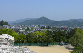 篠山城址から望む八上山。 2003.5.5. 八上山(462m)は篠山盆地の南に位置し、 地図では「高城山」と書かれている。別名、朝路山。 形がいいので丹波富士とも呼ぱれる。 井上靖の小説「戦国無頓」の舞台である 明智光秀の波多野氏攻めで有名。 典型的な山城。 山頂には波多野聖秀治公の大きな表忠碑があり、 本丸跡は広い。立木の間から断片的に 多紀アルプス、大野山、弥十郎ヶ岳が見える。 |