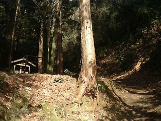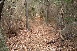 【山道】 二三度三叉路の合流点を過ぎた後、大きく左に谷を巻く植林の中のヘアピンカーブ。