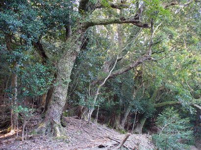 広い展望のないまま高度は下がり鬱蒼とした森の中の道。見たこともない照葉樹アカガシの大木群。