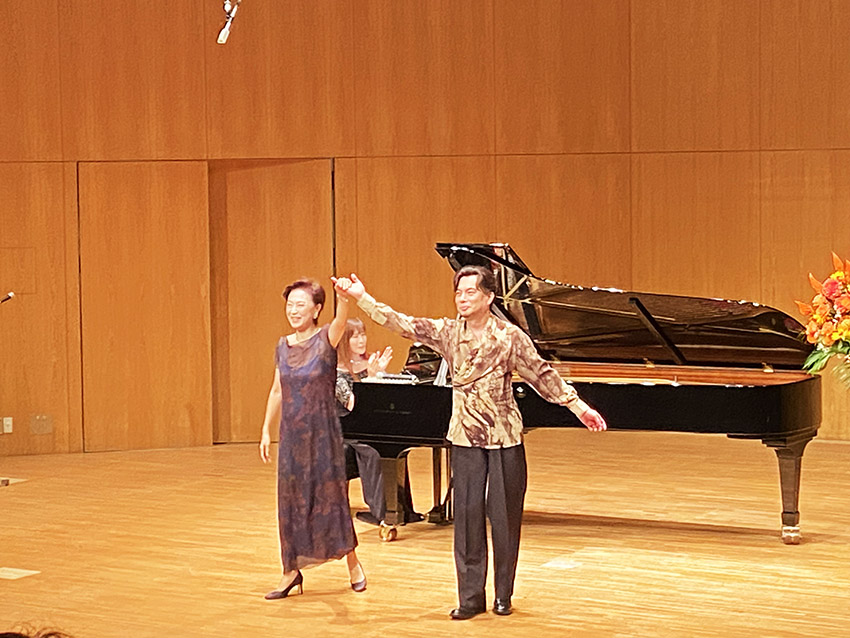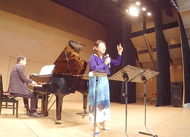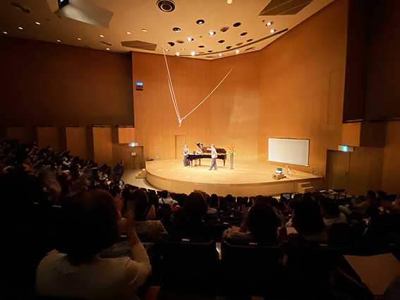 がピアノ。楽しい講座でした。113名の観客の皆さんは過去最高だと。主催者も大喜びでした。我々も感激。未曾有のコロナがようやく収束したのかなと感じさせるように、、、、みなさんには大きな美しい声で歌っていただきました。