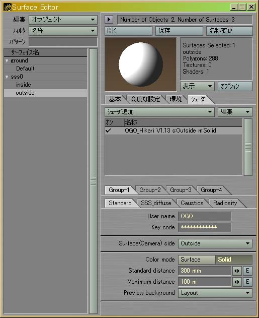 SSS users this | SSSの光源処理の時にコースティックで処理をする場合にチェックを付けます。(ただし非常に遅くなります) ※片面サーフェースのペアでモデルを作成している場合のSSSコースティック処理は、内向きサーフェース側のパラメータを使用して行います。(このチェックだけは表向きのサーフェース側に付けて下さい) |