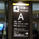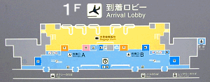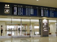 1階は主に到着ロビーとなっています。滑走路に向かって左手の「A到着口」と右手の「B到着口」に分かれています。 A側は主にJAL系列、JAS系列、そしてB側はANA系列が使用しているようです。 お出迎えの方は場所を間違えないようにご注意。両方の到着便が表示されているので、到着口をきちんと確認しないと間違えそうです。 |
