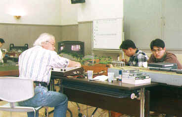 ポイントの操作は慎重に、不慣れな人では事故の元、なお手前に待機している人は、ポイント操作ミスで脱線した車両を復帰する係です? 奥のヤードでは次に走らせる車両をブックケースがら取り出し中。