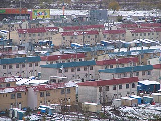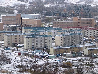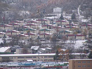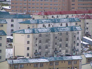 住友地区を見渡す。かつての炭鉱住宅群の背後に新しく福栄団地が新たに建設されました。