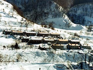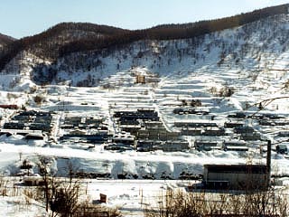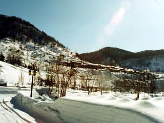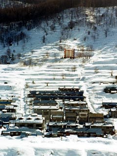 炭鉱住宅の風景を眺めるために谷を挟んで反対側の福住の炭鉱住宅の脇の雪原を登っていき、社光を正面に見ることができる高さまであがってみました。傾斜地にはかつては炭鉱住宅がびっしり立ち並んでいたはずですが、平成7年の時点の上の写真ではわずかに残るばかりでした。雪が段々になっている陰影が過去の風景を思い起こさせます。郷愁の丘はこの写真のちょうど中央の社光の中心街に新たにできました。
