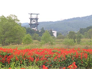 (写真左)赤い文字で赤い花サルビア炭田の看板がありました。(写真右)遠くに住友赤平炭鉱の立坑を望みます。
