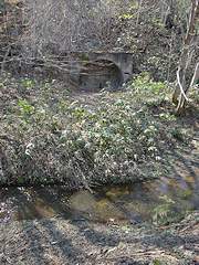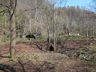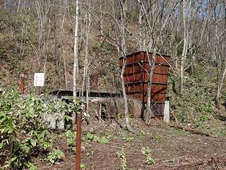 春光台を過ぎ林道を下って行き沢に降り、さらに沢を詰めていくと住友赤平炭鉱二坑総排気立坑の施設があった一帯に到達します。写真左は通洞四区間西口と奥に総排気の施設。写真右は通洞四区間西口の沢を挟んだ反対側で密閉されていました。