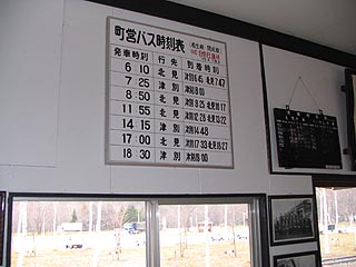 北見相生駅は全体が保存され相生鉄道公園になっています。駅舎も保存されバスの待合室としても利用されています。写真左は本岐駅で使用されていた発車時刻表。写真右は町営バス時刻表。今でも全体の整備は行き届いていて相生の人々の鉄道への暖かい心を表しているかのように感じました。