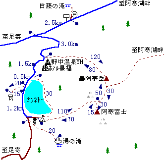 (交通:阿寒湖畔-[バス20分]-雌阿寒温泉-[バス10分]-オンネトー-[バス5分]-湯の滝入口)