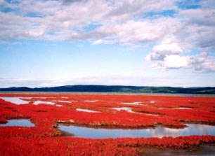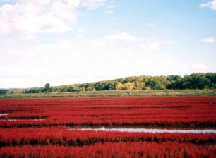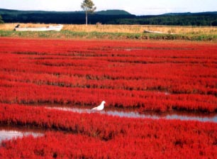 ■能取湖のアッケシソウ群落 アッケシソウの群落はその名前の通りの厚岸湾、そして南オホーツクの能取湖、サロマ湖などにあります。 塩分に強い植物で湖岸の湿地帯に生息します。 おもしろいのはその姿で葉というものはなく茎だけが針山の様に湖からつき出ています。 最大の特徴はサンゴ草とも呼ばれることで分かるように9月頃に赤く染まります。 中でも最も美しいといわれているのがこの能取湖卯原内のアッケシソウです。 他の群落に比べて密集してアッケシソウが群落をつくっているため湖面は一面の深紅といってもいい程でこたえられません。