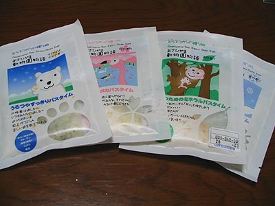 旭山動物園のお土産は数年前にはめぼしいものは全くないような状況だったのですが今は様々な商品に旭山動物園の名前が付けられています。あさひやま動物園物語は入浴剤でシロクマ、フラミンゴ、サル、ペンギンの絵柄で4種類があります。基本成分は同じで海塩、塩化ナトリウム、シリカ、加水分解コラーゲンが入っていて、さらにそれぞれに工夫が凝らされた素材が入っています。この商品、旭山動物園との関連を問われると困るのですがどれもが入浴感はなかなかのものでお土産の商品としてはお薦めです。