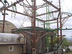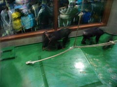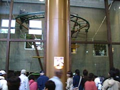 私が訪問した日は残念ながら雨天で外でチンパンジーが遊ぶ姿を見ることはできませんでした。屋外の放飼場は複雑怪奇でどのようにチンパンジーが動き回るのか気になります。スカイブリッジと名付けられた通路が中央に通っていて様々な角度からチンパンジーを観察できるようになっていました。しかしながら混雑時はたぶん立ち止まってのんびり眺めるということはできないのでしょう。
