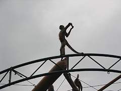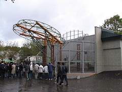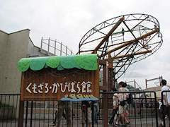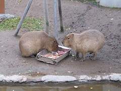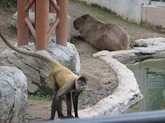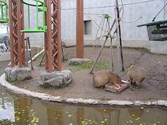 くもざる・かぴぱら館 。平成17年8月オープン。新規の施設では小さなものですがクモザルとカピパラの混合展示を行っています。クモザルは地上より上の遊具で活動し、カピパラは地上でのんびりしていたり水中で活動するとのことです。雨天時はクモザルは屋外には出てきません。 クモザルが地上にさっと降りてきましたがカピパラは全く気にしていませんでした。遊具のクモザルは活発に活動していました。 カピパラが食事中に訪問。