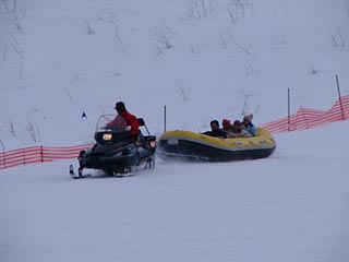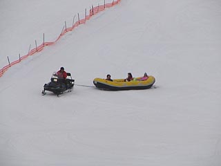 私は乗ってはいないのですが歓声が響いていたのがスノーラフティング。スノーモービルに引かれたゴムボートがクルクル回転していて、遠心力もかなり働いているのでしょう。なかなか面白い乗り物なのではないかと思います。300円。