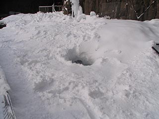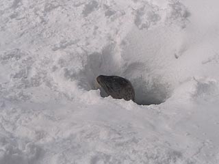あざらし館の冬の注目は平成20年1月に初めてプールの一部を凍らせることに成功したことです。その結氷した氷には穴があけられていて時折あざらしが顔を出すのです。これもいつあざらしが顔を出すかは予測ができず、ただひたすらに待つ必要があります。