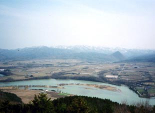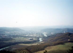 ■展望台から芦別市街を望む 芦別市街を空知川がのんびり流れています。 芦別、赤平などは山間であまりこのような開けた風景は期待できないと思っていた私の固定観念は見事に打ち破られました。 この上金剛山の微妙な位置がこの絶景を生んだのです。