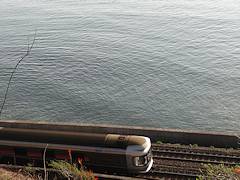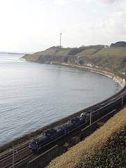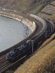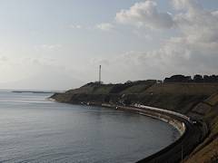 八雲で宿泊。翌朝の行程を考え夕食をとっていると八雲駅至近のビジネスホテルはトレインビュー。上り北斗星が真横に停車しました。それなら翌朝はまず下りの寝台特急の撮影をしてから山中に入ろうと方針を転換し噴火湾を望む展望台に行きました。先客の脇で小さなカメラで撮影。 カシオペアは数分遅れで通過していきました。駒ケ岳はうっすらと霞の向こうに望むことができました。