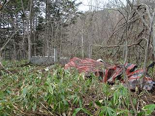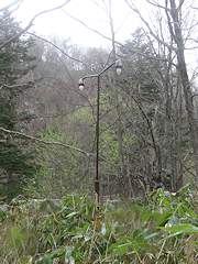 現在温泉跡へ向かう橋は落ちてしまっていて橋台が残るのみ。川を渡り笹藪をかき分けていくと印象的な街灯が出現します。