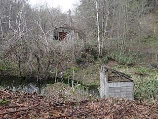 採掘域を本格的に美唄川沿いの延ばすため、索道頼りだった輸送を輸車路に切り替えるために造られた茶志内通洞。写真左は東側坑口ですが意図的に壊されたかのような状態でした。写真右は、その後東に向かう輸車路の明かり区間、築堤になっていました。