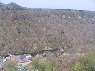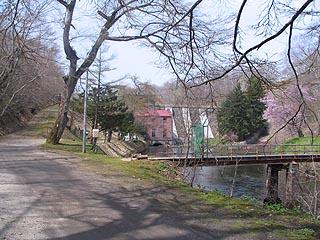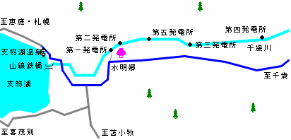 千歳第一発電所のある水明郷は桜の木々が調整池の周りに植えられていてちょっとした公園になっていて、眼下に発電所を見渡す場所までは開放されています。かつてはこの地には小学校もある集落がありました。