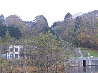 第一PS堰堤から調整池に送られた水は発電所のある河畔まで130mの高低差を利用して発電を行います。