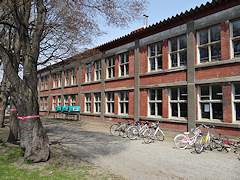 訪問した人の自転車が連なる校舎前。中庭もいい雰囲気でした。
