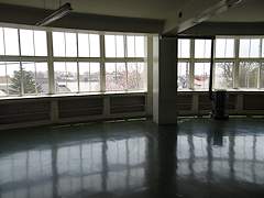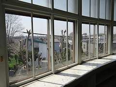 円形校舎の教室部分。窓の下に生徒の物入れが並んでいます。