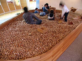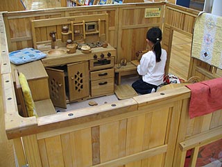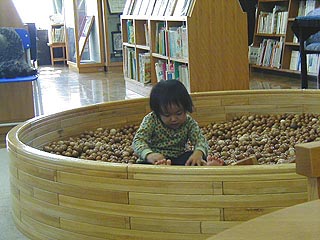 木の遊具がたくさんあるのも子供にとって嬉しいでしょう。写真左が「ごっこはうす」でおままごと道具が満載です。写真右が「たまごのへや」の内部で木の卵の巨大なプールになっています。初代絵本の館から大きくスケールアップしたプールは壮観です。