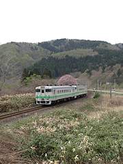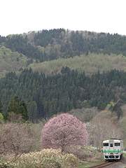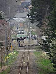 江差線の湯ノ岱駅からさらに天の川を下って行ったところの線路端にヤマザクラがぽつんと一本立っていました。均整がとれたサクラは丁度満開で、その脇を最後の春を迎えた江差線が通過していきます。2両編成でした。 湯ノ岱駅を出発する江差線の列車。駅は大変賑わっている様子。駅からいつのまにか営業している唯一の温泉になってしまった保養センターまで歩く人も散見されました。先程のサクラと江差線を撮影した場所から500m程湯ノ岱方面に行った場所で撮ることになりました。