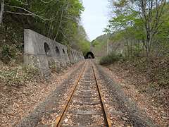 雪崩覆いの銘板には「なだれおおひ 延長85m600 設計 青函船舶鐡道管理局 施工 札建工業株式会社 着手 昭和32年9月12日 しゅん工 昭和33年5月20日」と記されていました。この雪崩覆いは健在でしたが、さらに奥に行った先の路盤はトンネル工事のヤードとして整地されていました。中に入ると別世界となり静寂を感じることができるのが魅力です。