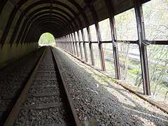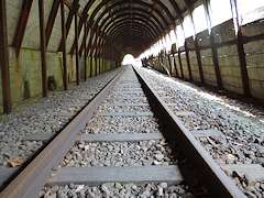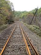 江差線の吉堀−神明間は山越えの区間で雪崩覆いが5箇所ありました。廃線から約1年たった後に、その雪崩覆いのひとつを訪問してみました。道道5号線と江差線が交錯する地点から築堤に上り、雪崩覆いまで歩いていきましたが、わずか1年で枕木はぼろぼろ、線路も表面は赤錆で覆われていました。