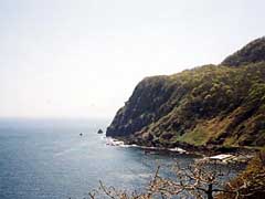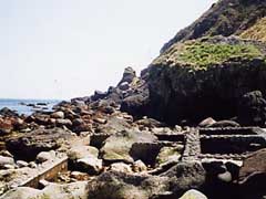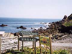 恵山岬からさらに東に行き海岸に下ったところにあるのが水無海浜温泉です。この海辺の温泉は以前は写真のようなものでしたが平成15年7月に改修されきれいに生まれ変わり脱衣所も設けられました。とはいっても温泉というよりは水着を着て海遊びをする延長線上に暖かいプールがあるという雰囲気です。また満潮時には入浴が不可能な時間帯があるので注意しましょう。