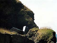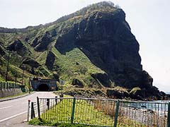 国道229号線の瀬棚から茂津多へ至る道筋は今でこそ全線快適な2車線の道路が続きますが随所に旧道の痕跡を見ることができます。瀬棚から6km程北にある蛇羅トンネルは昭和47年に完成したもので、開通前の旧道は蝦夷親不知と呼ばれた断崖絶壁の下を通っていました。南側の蛇羅の集落からはか細い旧道をの覆道、トンネルを望めますがそれら施設は30年の時代の経過によりかなり劣化が進んでいる気配でした。私は人目もある南側からの進入を避け、北側にまわることにしました。写真は北からのトンネルと旧道の全景です。