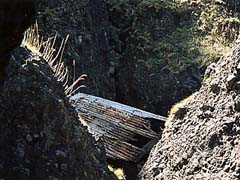 しかしながら旧道は荒々しく崩れほとんどその跡をたどることは残念ながらできませんでした。わずかながら旧道を歩き、あとは海岸の岩場から旧道のトンネルを眺めるほかなかったのです。そのトンネルの前には施設の残骸と思われるものがひしゃげて鎮座していました。