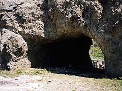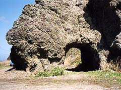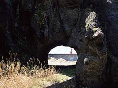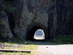 さらに北に向かい美谷漁港の脇の美谷トンネルの海側に旧道を発見しました。獅子岩の張り出した岩塊を昔は本当に小さなトンネルで抜けていたのです。写真左が北側から、写真右が南側からのもの。