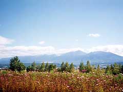 ファーム富田は比較的平坦なところにあるため風景的には平板ですが十勝連峰が彩りを添え楽しませてくれます。秋はコスモスが咲いていました。
